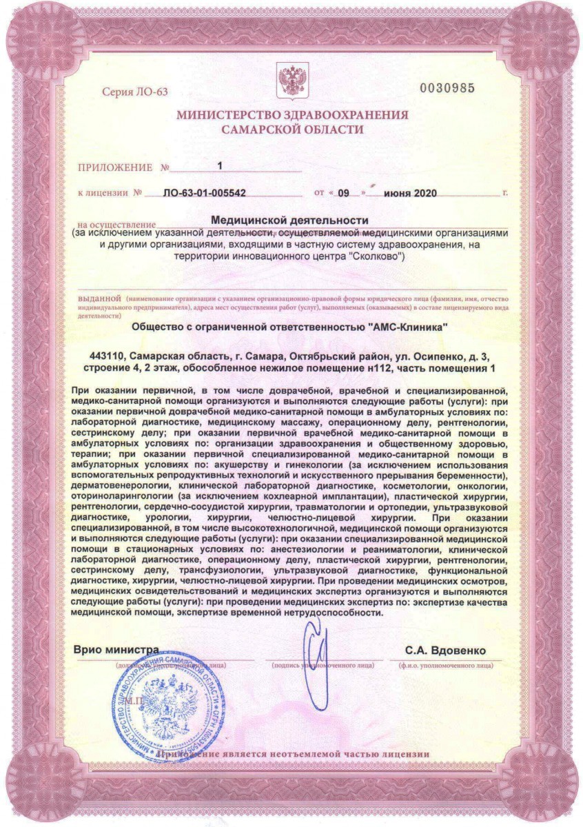 «АМС-Клиника» на ул. Осипенко г. Самары (м. Алабинская) – это многопрофильный специализированный медико-хирургический центр, оказывающий полный спектр медицинских услуг по диагностике, лечению и реабилитации пациентов. «АМС-Клиника» имеет в своем составе поликлиническое отделение, лабораторию, диагностическое и рентгеновское отделение, операционный блок, отделение анестезиологии и реанимации со службой переливания крови, стационар. Одним из основных направлений деятельности нашего хирургического центра является проведение пластических операций. Клиника оснащена современным медицинским оборудованием и лицензирована в соответствие с последними требованиями Министерства здравоохранения РФ «Порядок оказания медицинской помощи по профилю «пластическая хирургия», что является в настоящее время своеобразным «знаком качества» в частной медицине.
